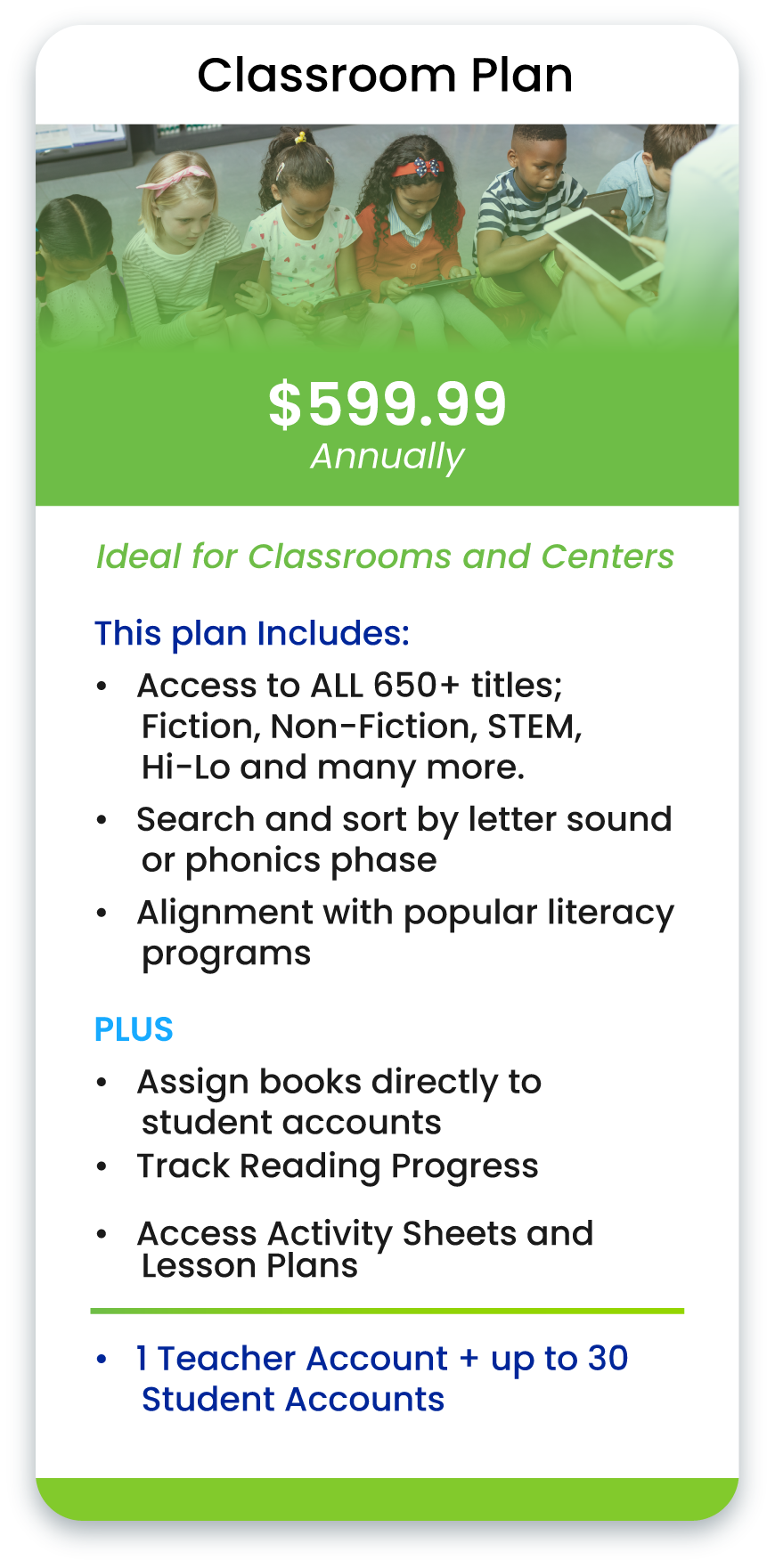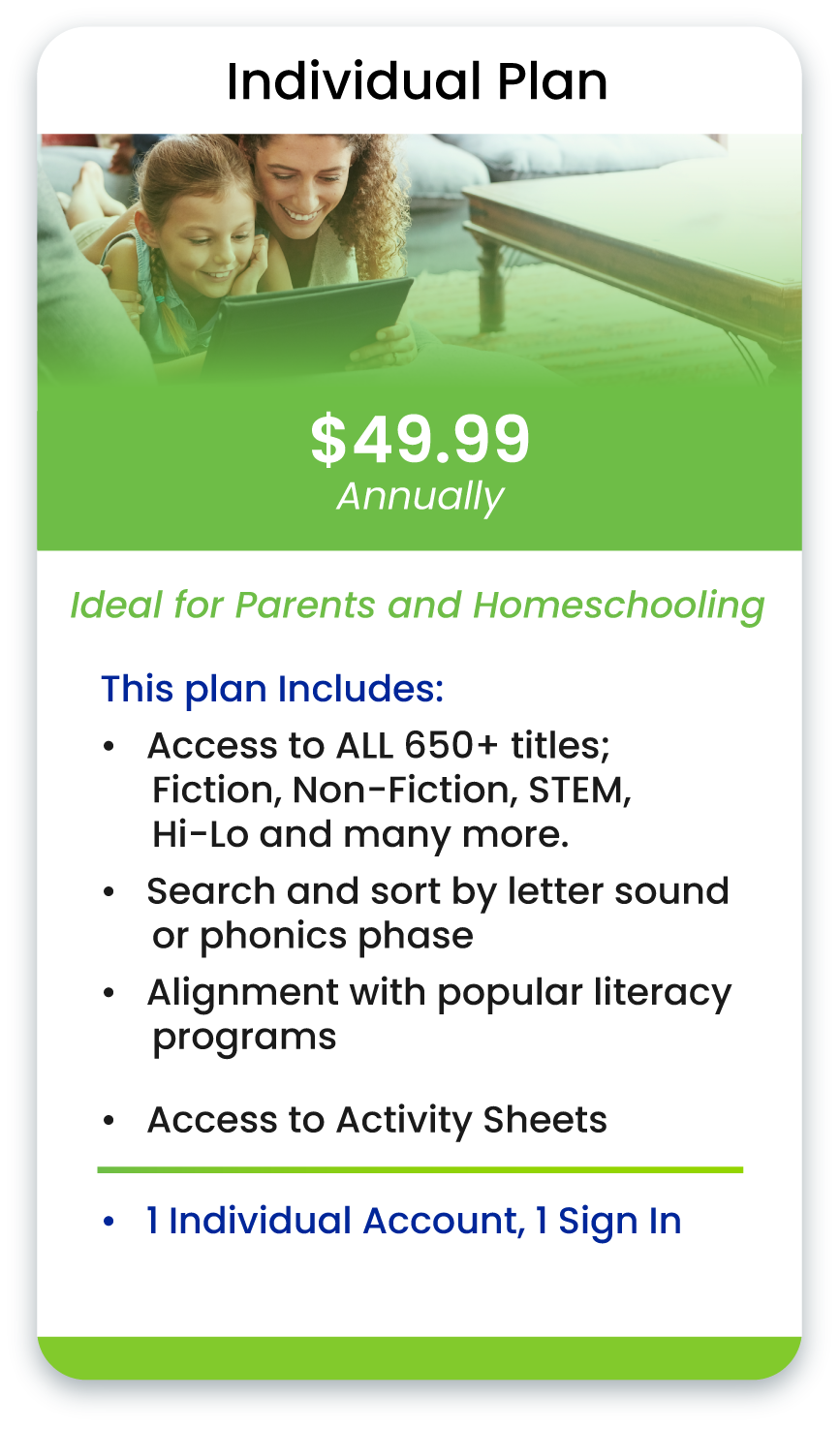 Introducing our all new e-reader specializing in decodable texts and teaching letter sound correspondences. Designed to help early readers build confidence and fluency through a systematic, phonics-based progression, each story is carefully crafted to make reading both accessible and rewarding. Our simplified platform is interactive and easy to navigate, and makes accessing our over 650 + book titles efficient. Parents and educators can track progress, monitor fluency, and celebrate achievements along the way. Whether used at home or in the classroom, our decodable e-reader supports consistent, effective reading practice that grows with the learner.